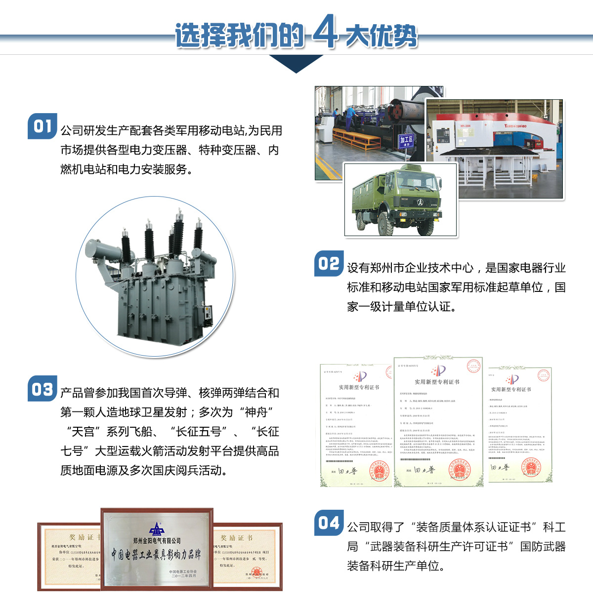 鄭州金陽電氣有限公司是由鄭州市國資委控股的國有獨資企業(yè),是原機械工業(yè)部在上世紀五十年代投資建立的移動電站和電力變壓器生產(chǎn)企業(yè)。公司下設電站公司和變壓器公司及其它配套公司,長期以來在國內(nèi)移動電站和電力變壓器行業(yè)占有重要位置。是河南省具備設計生產(chǎn)110kV電壓等級以上電力變壓器資質(zhì)的企業(yè),是國家經(jīng)貿(mào)委首批推薦城鄉(xiāng)電網(wǎng)建設與改造所需變壓器的生產(chǎn)企業(yè)。河南省變壓器檢測中心設在我公司。
